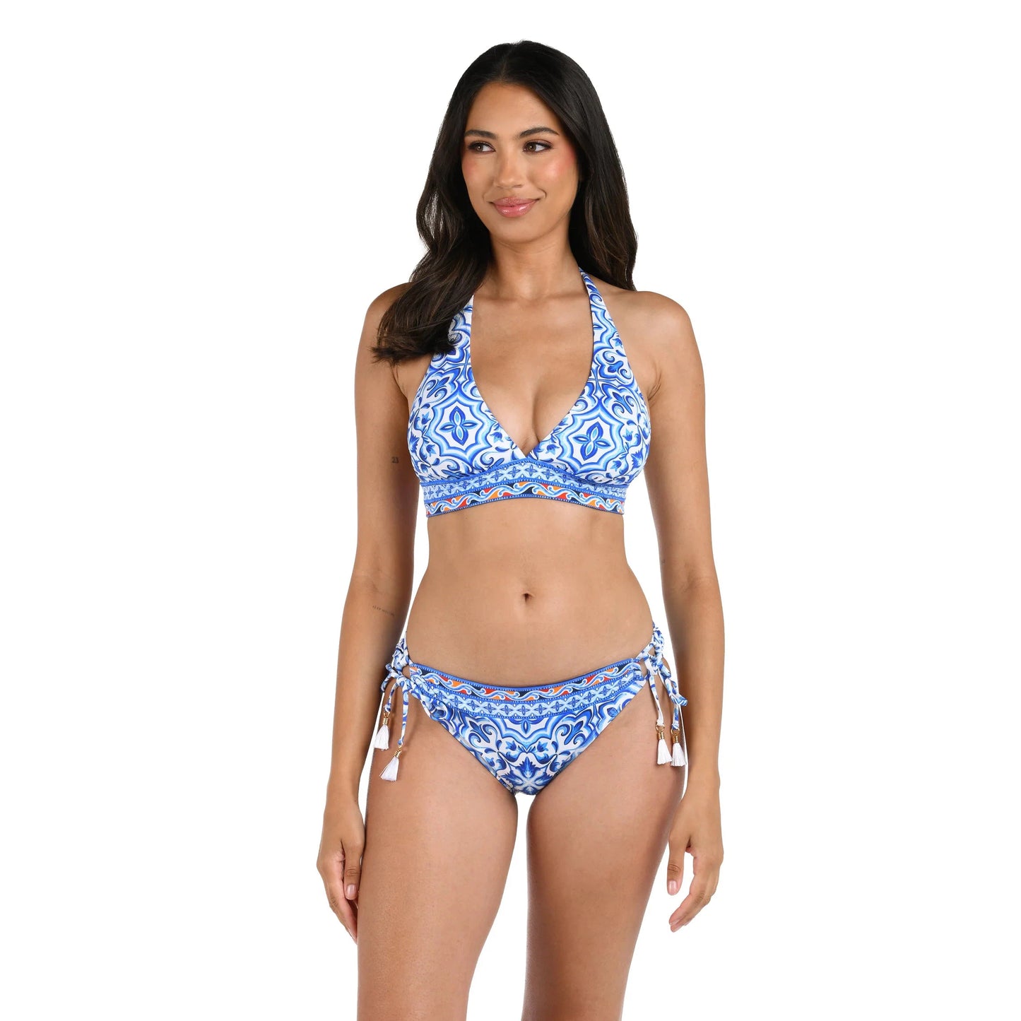 You're all angles in this top, thanks to a deep V-plunge neckline with a wide band underneath and halter straps that draw the eyes upward while balancing your shoulders. Adjustable straps that tie around the back are finished with tassels.