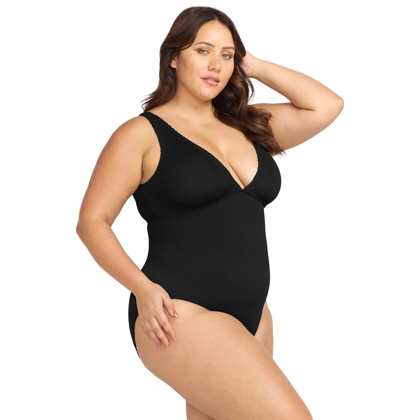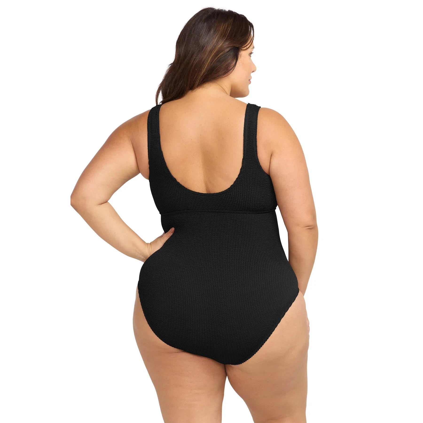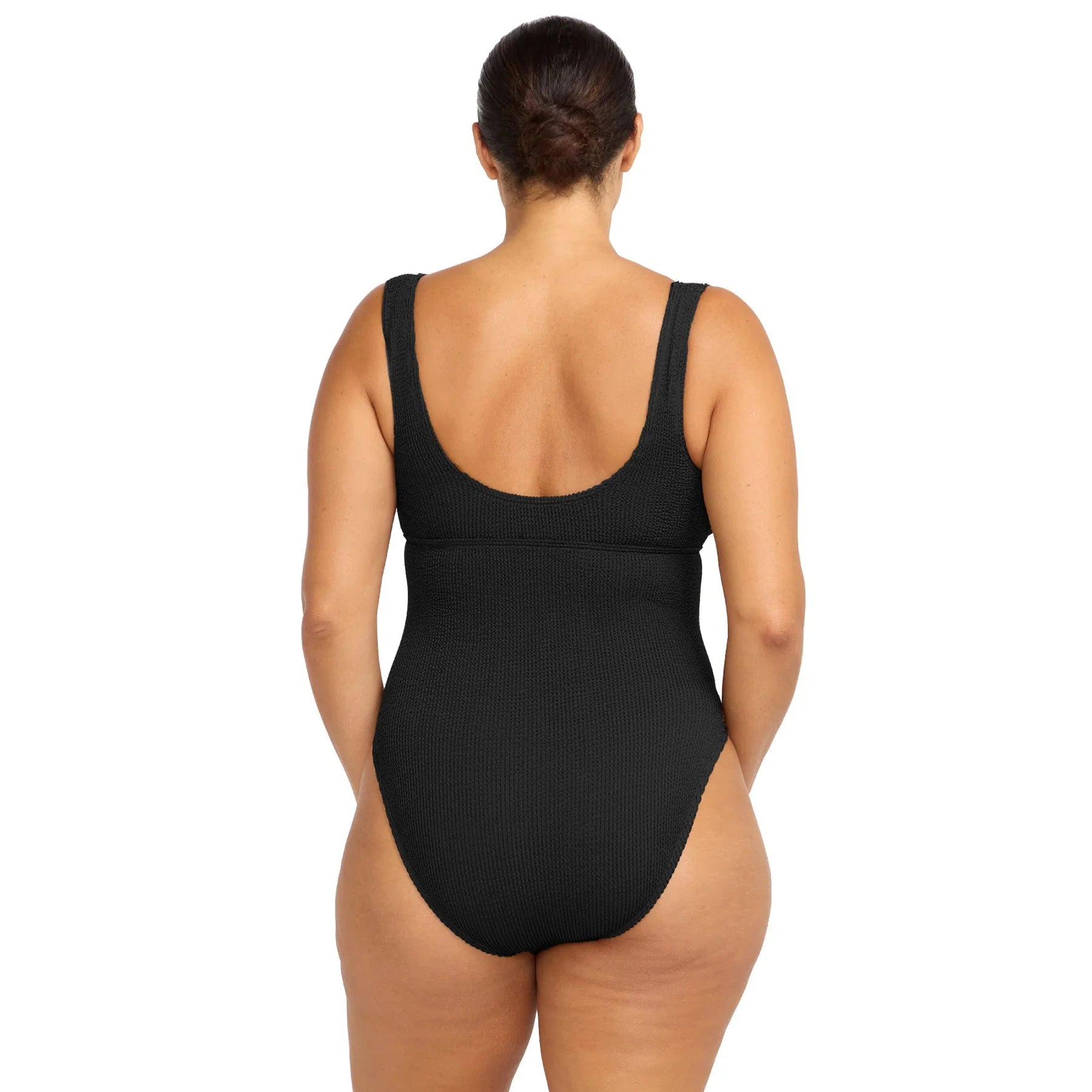 Embrace your shape with the latest Arte series. Introducing the scoop back, sleek one-piece swimsuit featuring a long line style and high cut leg. Made from their one-size crinkle tubular knit fabric, this swimsuit adapts to various body shapes, fitting sizes AU12/US8 to AU22/US18. Celebrate your curves with Artesands.