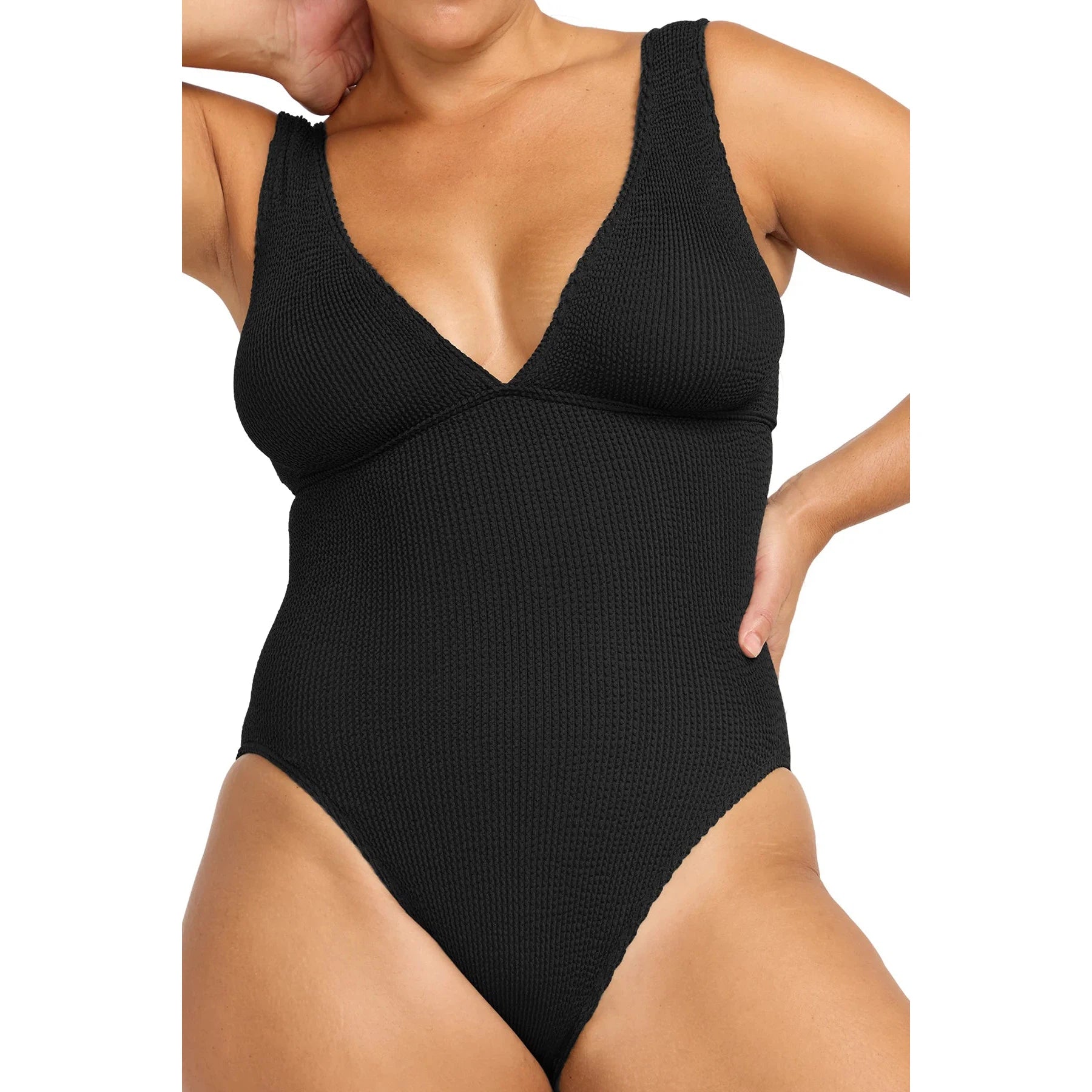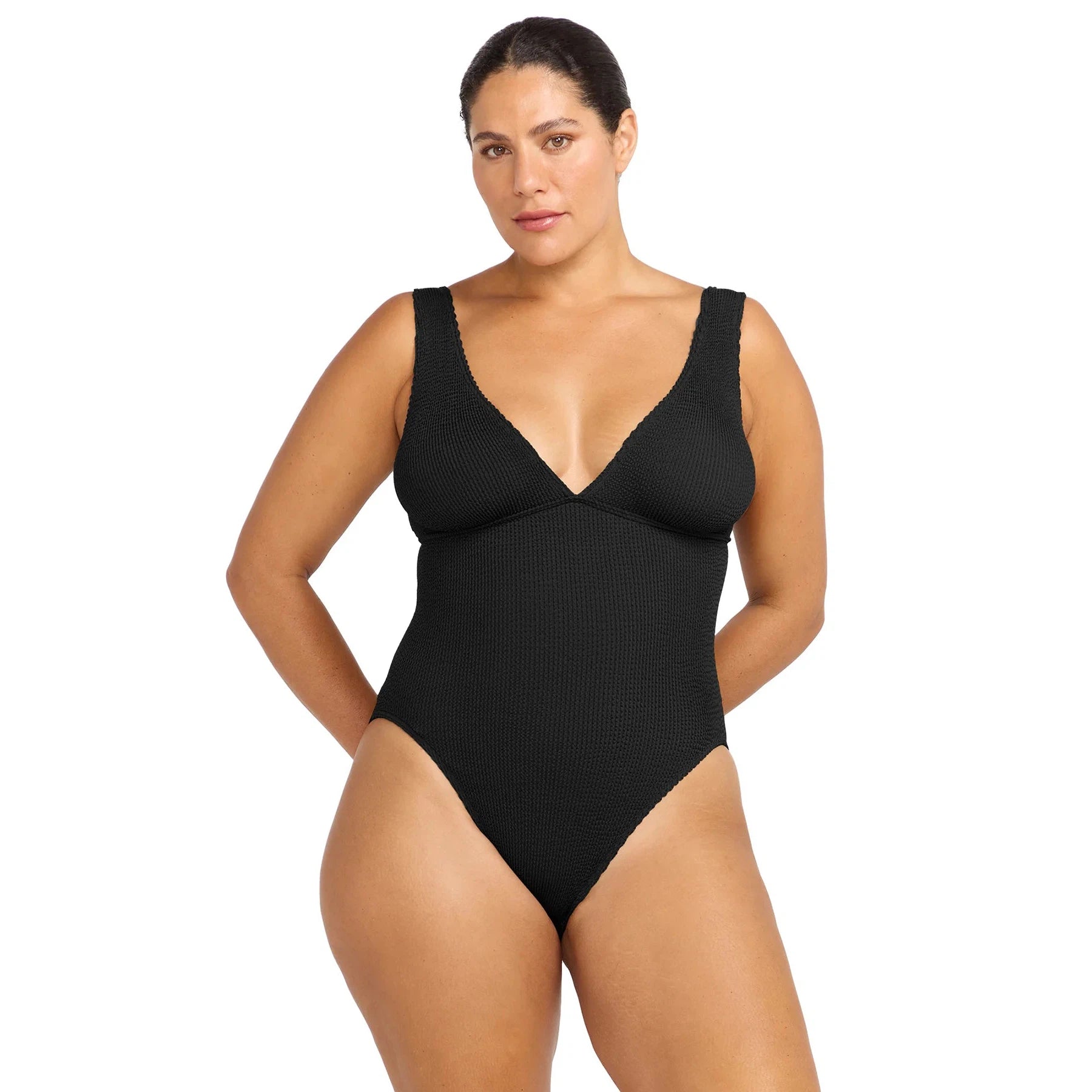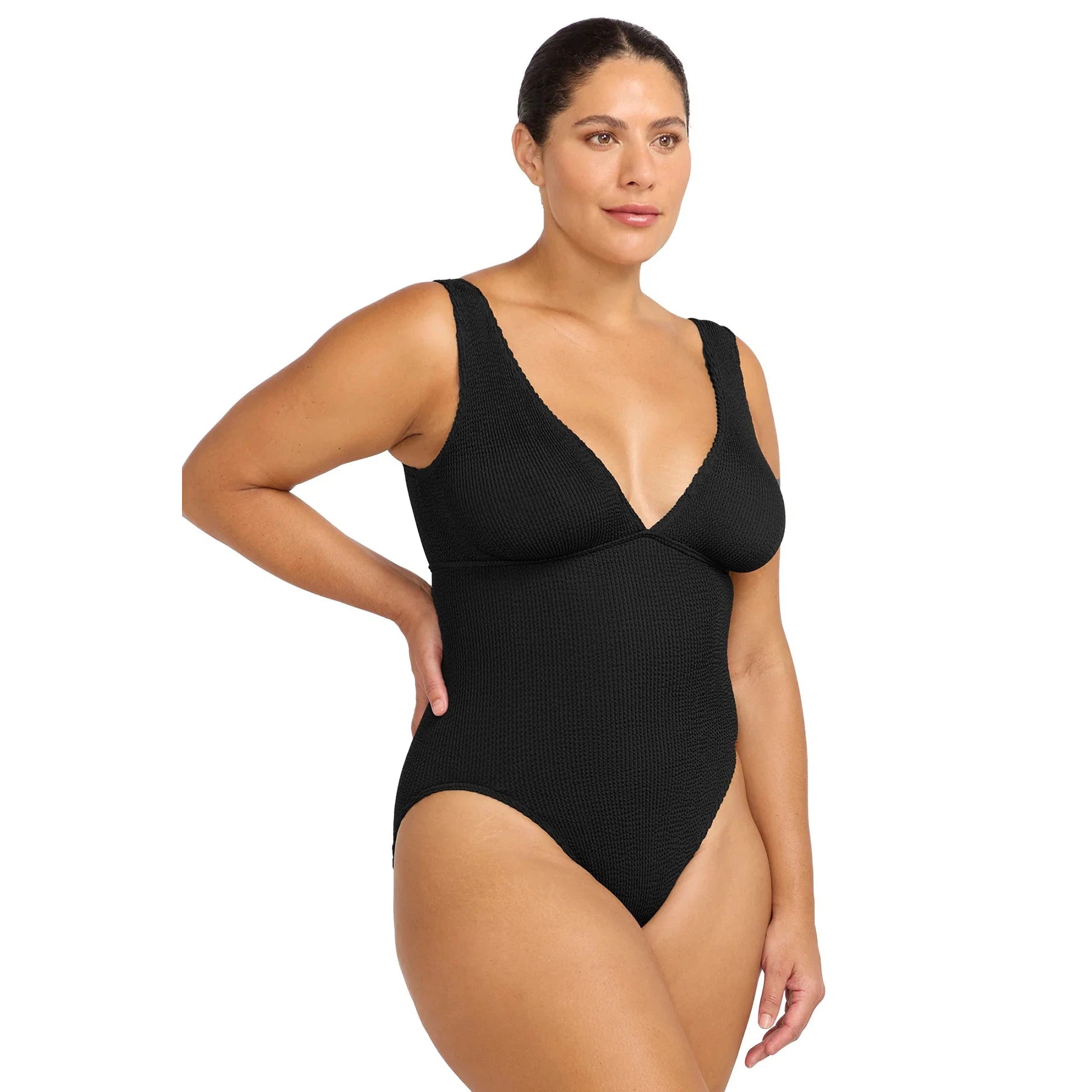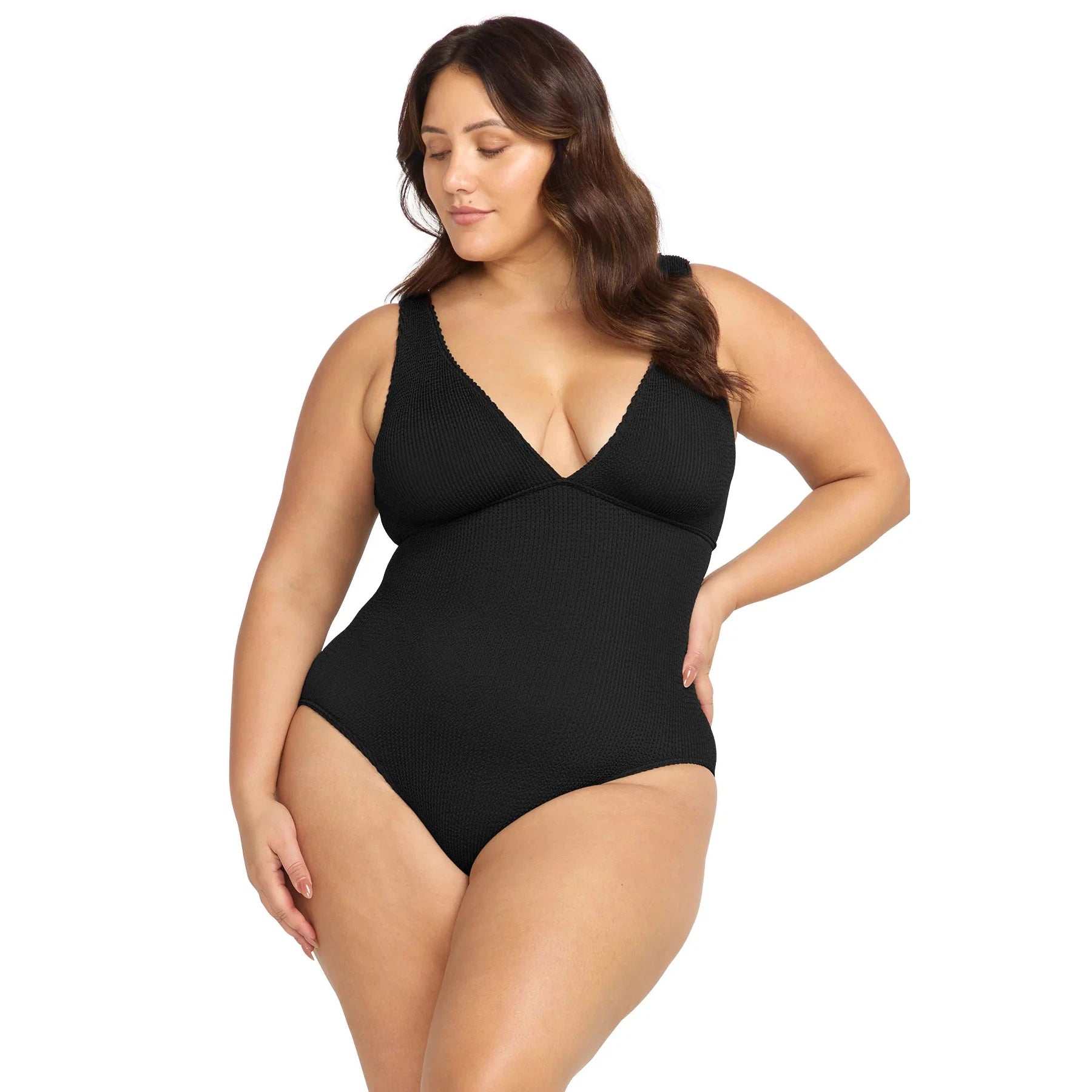 Embrace your shape with the latest Arte series. Introducing the scoop back, sleek one-piece swimsuit featuring a long line style and high cut leg. Made from their one-size crinkle tubular knit fabric, this swimsuit adapts to various body shapes, fitting sizes AU12/US8 to AU22/US18. Celebrate your curves with Artesands.