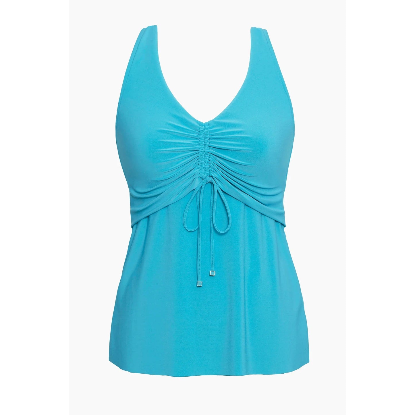 The Arya Tankini. The Arya accentuates the bust with a soft v-neckline and front tie detail. This tankini has a full straight back and adjustable straps and is completely wireless for ultimate comfort.