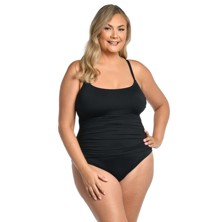 Sunbathe seaside in this lingerie one-piece swimsuit by La Blanca. The delicate and simple lingerie shape exudes a simple, feminine style. Adjustable straps and removable cups allow this piece to fit to you. Slimming fabric finishes the smooth, delicate look. Moderate rear coverage.
