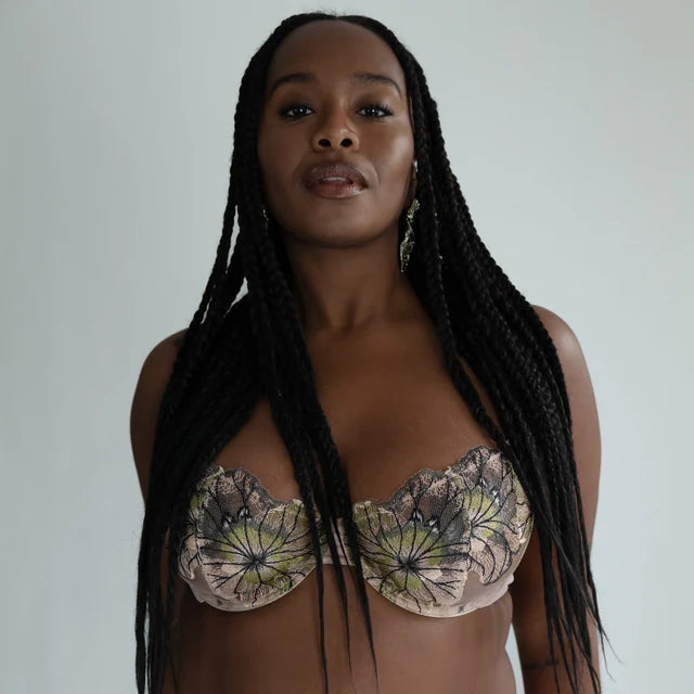 The Jordan Plunge Bra is an elegant blend of delicate beauty and everyday support. Crafted from embroidered tulle and stretch satin, this piece is designed to feel as special as it looks. In soft muted pink and olive tones, this bra is perfect to wear on its own or subtly peek through beneath a white blouse—adding a touch of charm to your daily look.