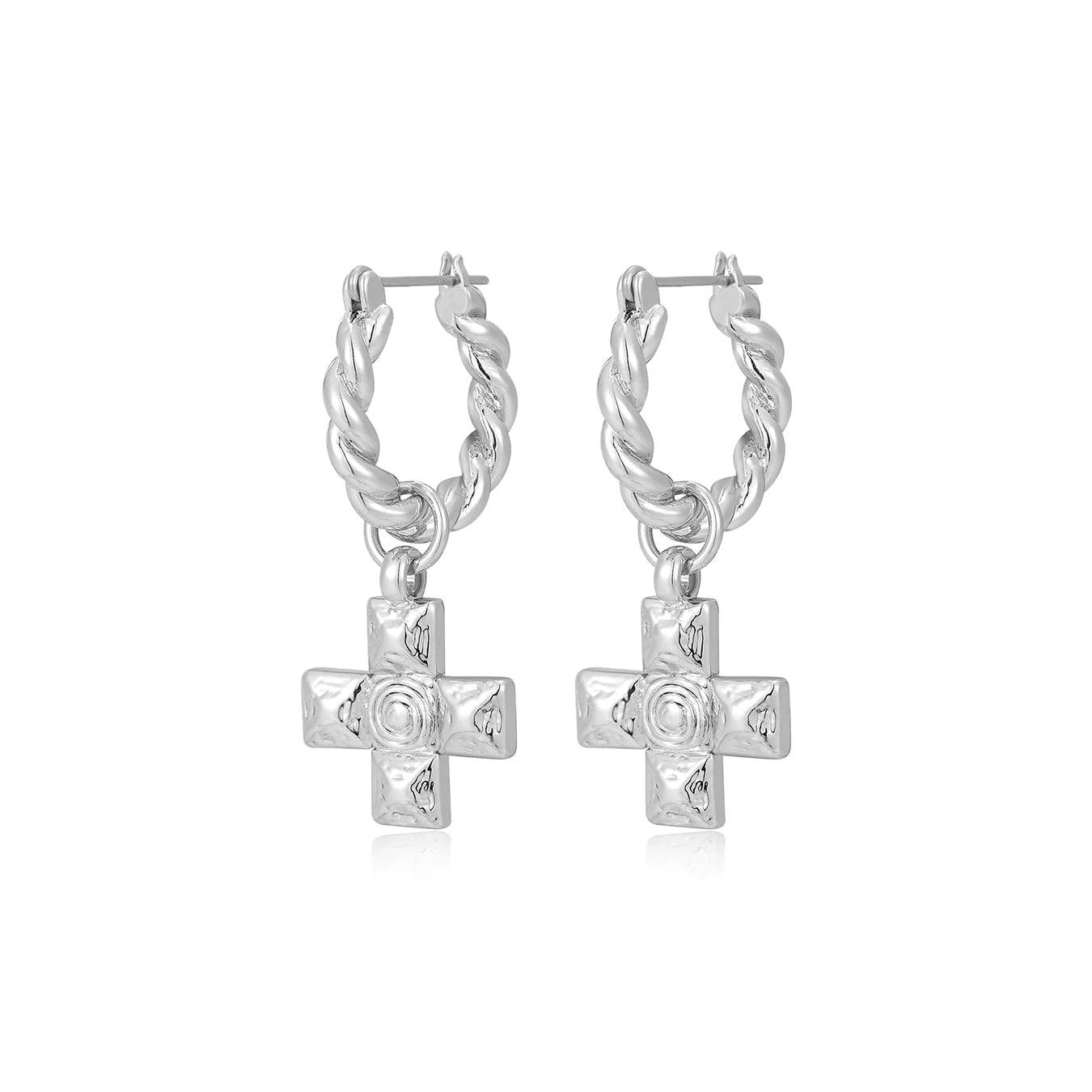 Pair of mid-size twisted metal huggies with a textured cross charm