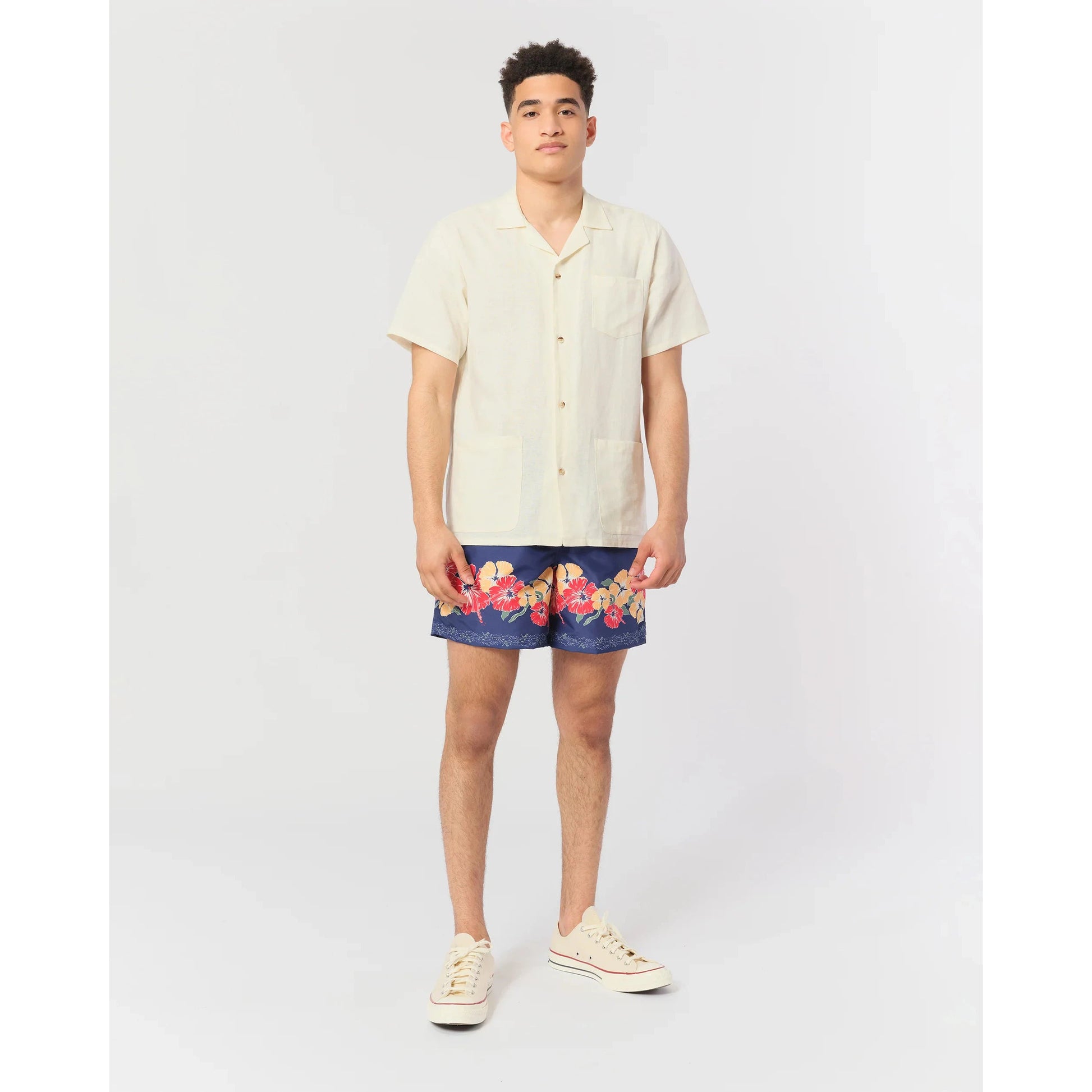 Pair this print with some flip-flops and a t-shirt if you have a t-shirt but just flip-flops if you don't have a t-shirt. Also pairs with the matching camp shirt if you don't have flip-flops or a t-shirt. Panel-printed hibiscus flowers line the hemline.