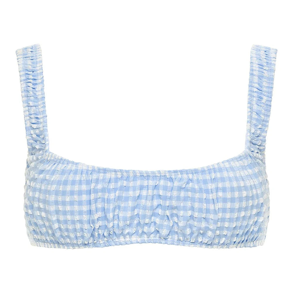 Playful meets polished in the Peri Micro Gingham Zoe Top — a romantic swim silhouette with a modern twist. Designed in a soft blue gingham and finished with delicate ruching, this cropped top features a flattering square neckline and feminine puff sleeves that can be styled on or off the shoulder. A subtle button detail adds charm, while boning at the sides provides added structure and support. With a secure G-hook back closure and easy pull-on fit, it’s equal parts style and comfort.