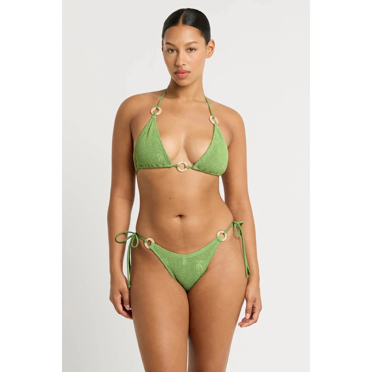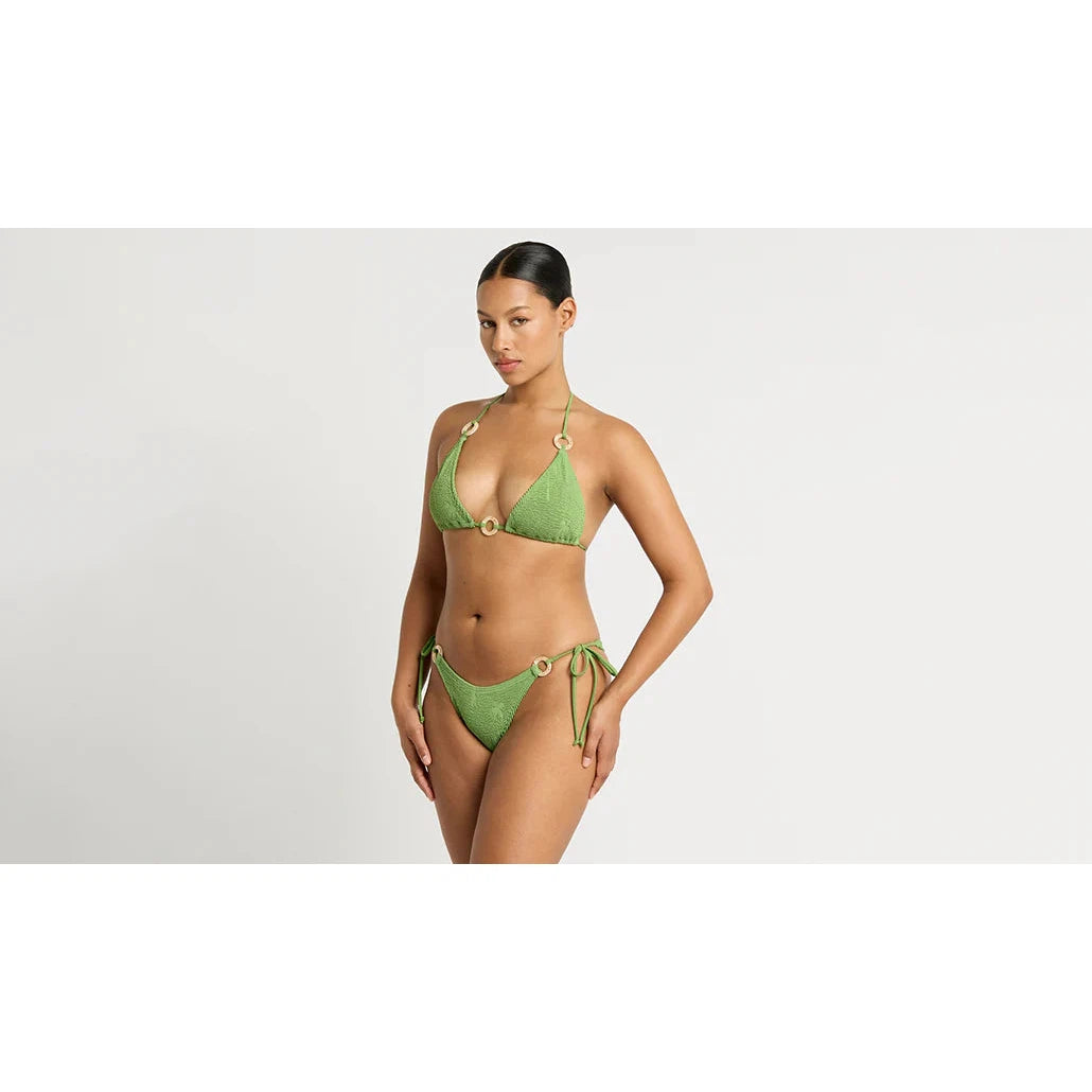 Indulge in luxury with the Ring Serenity Brief. This tie side bikini brief offers cheeky coverage and adjustable tie sides for a perfect fit. Versatile enough to wear high or low on your hips, it features elegant shell ring detailing and is made from the signature Authentic Crinkle™ fabric. Elevate your beach style today.