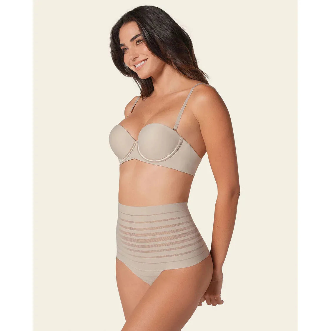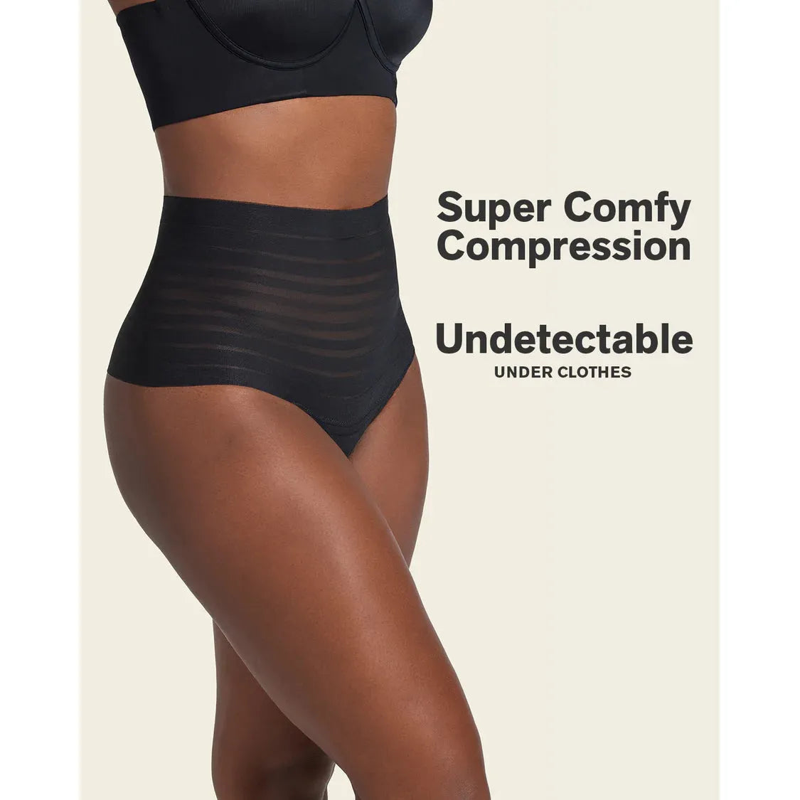 Shape and smooth with total confidence. This high-waisted thong delivers comfortable compression to smooth your mid-to-lower tummy without pinching or rolling. Designed with a waistband-free and leg band-free construction, it stays invisible under clothing for a flawless finish—no lines, no digging.