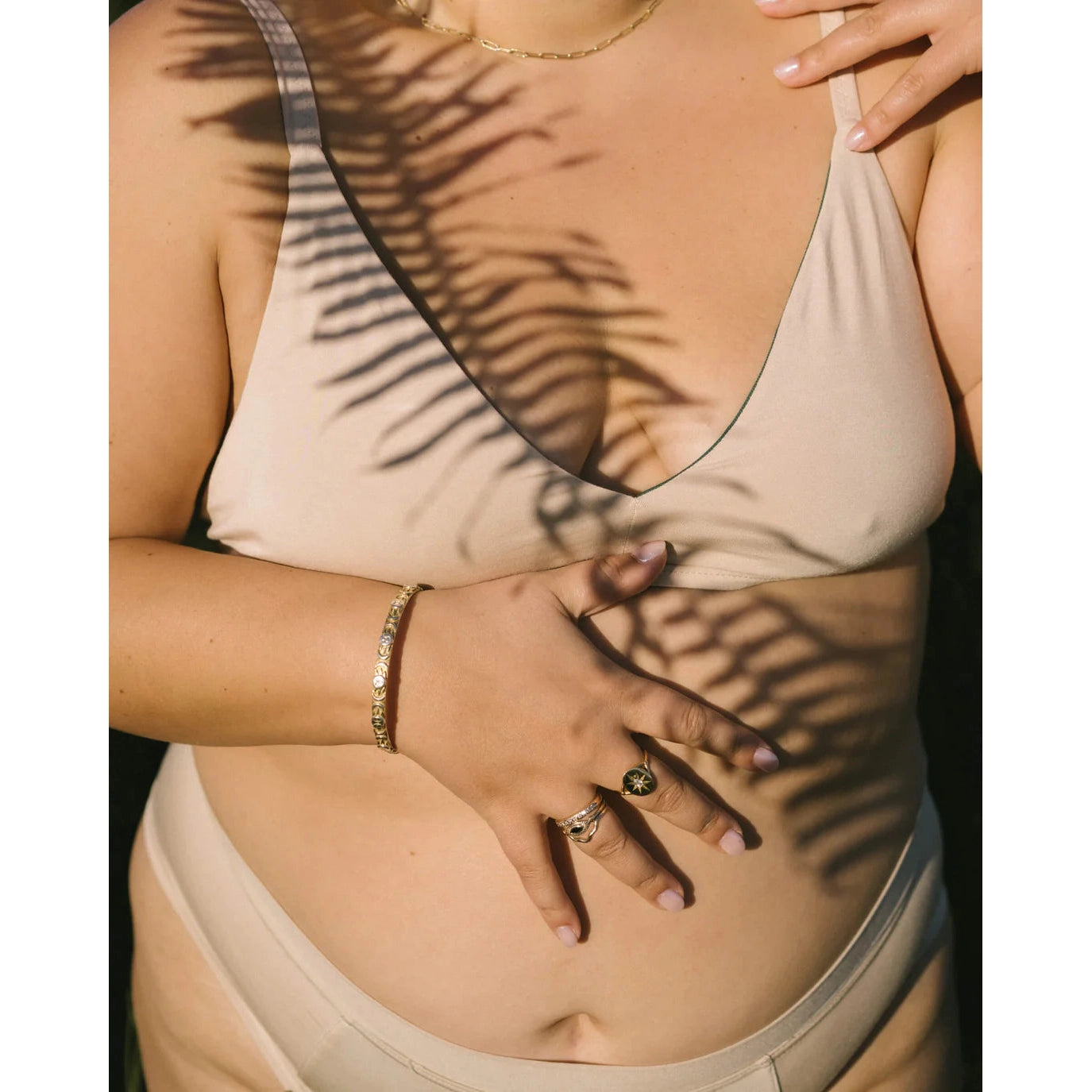The Triangle Bra. You'll likely find yourself wearing it on the daily. The Triangle Bra is lined with a zinc-infused, mineral-protected liner to keep you fresher, longer. The Triangle has adjustable straps and adjustable straps to adjust the support you need.